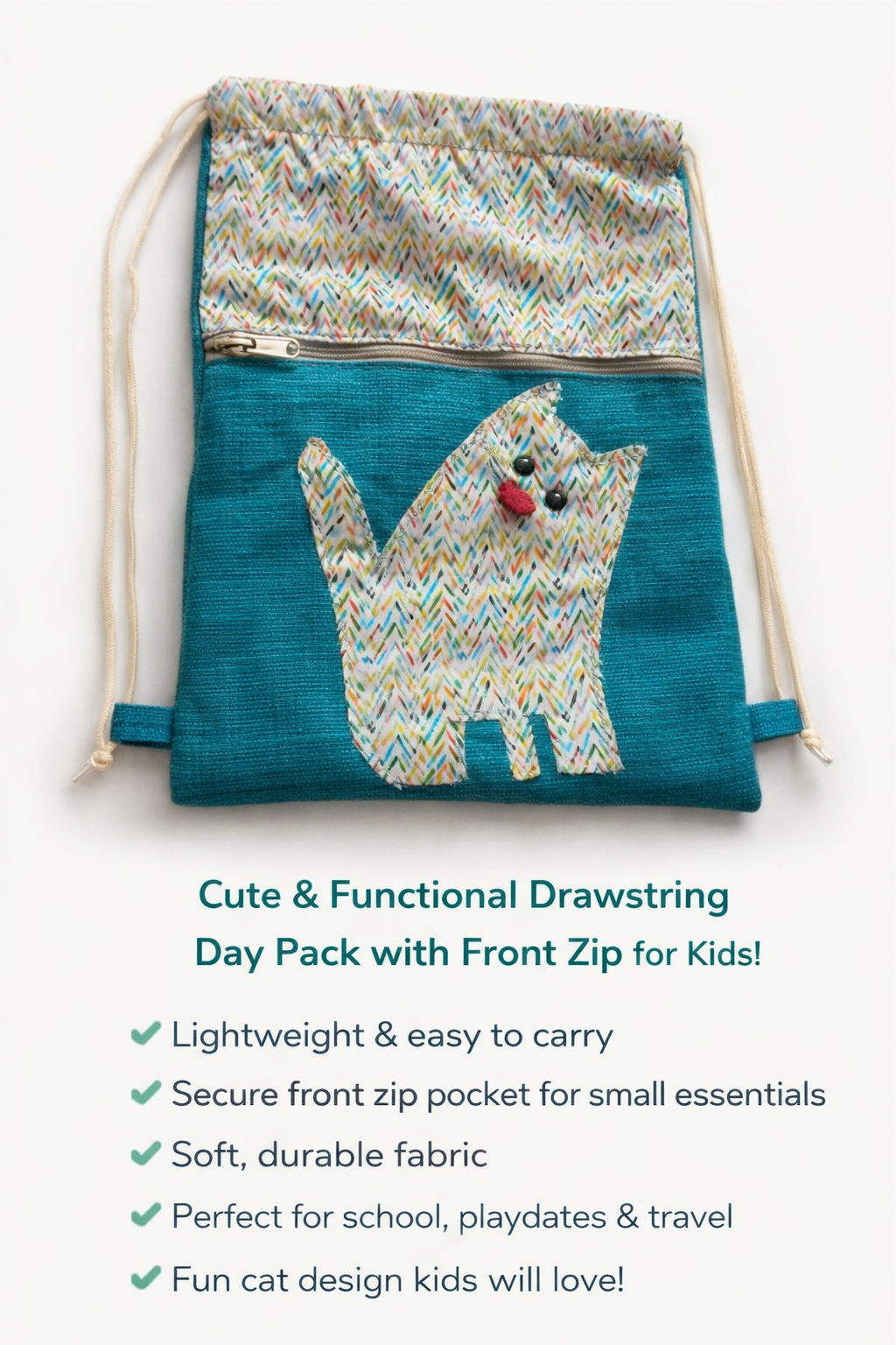 A lightweight and eco-friendly drawstring backpack made with unlaminated jute and cotton fabric. Designed with a secure front zipper pocket and an adorable cat applique, this day pack is perfect for school, playdates, travel, and daily outings.